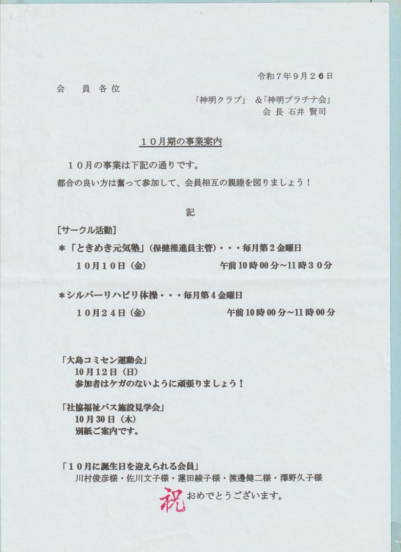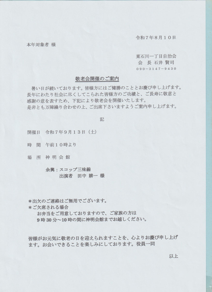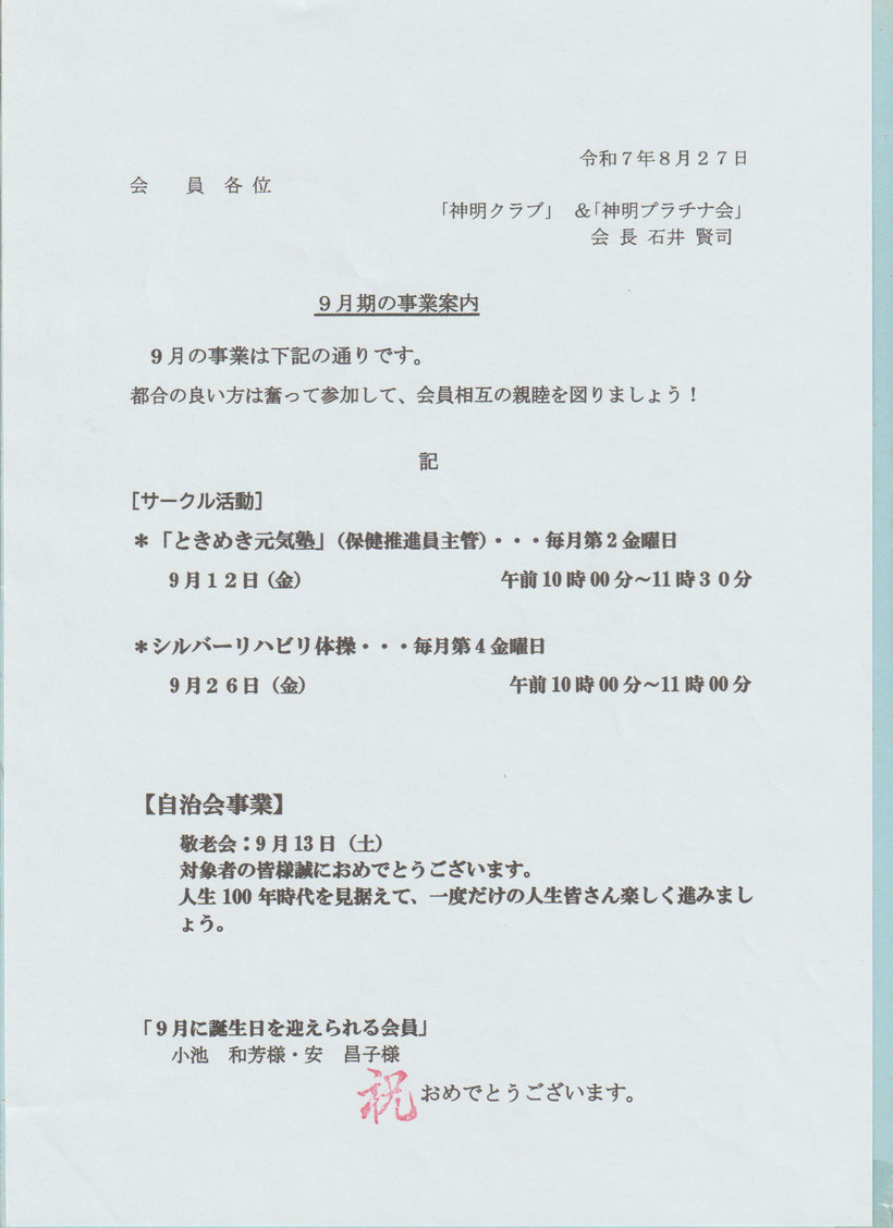 親睦会(8/17)、市総合防災訓練(8/30)、敬老会(9/13)のご案内です。